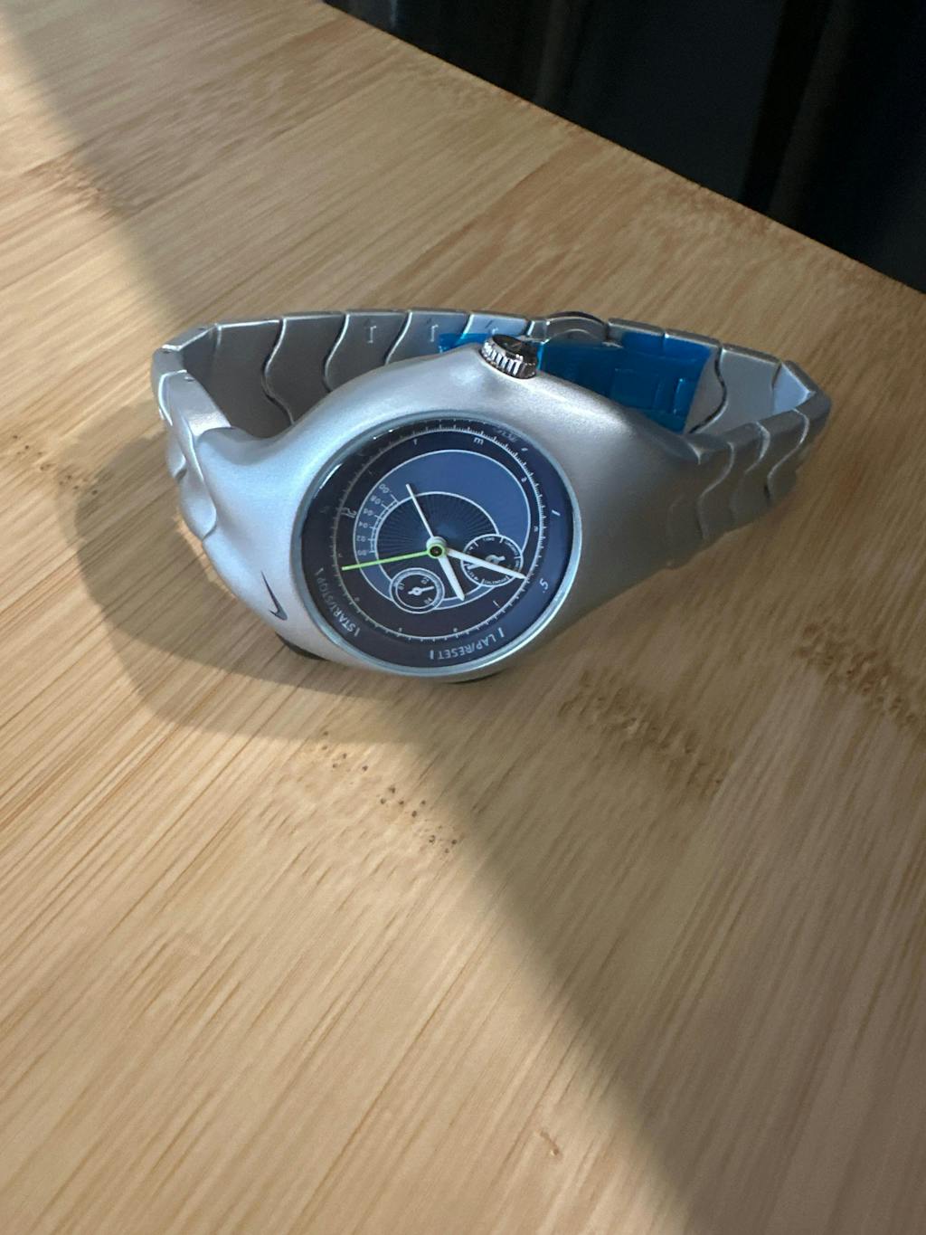 Nike Triax Chronograph Watch Matte Silver with blue dial – Vintage Grey Stainless Steel Sports Watch, Rare Collectible Timepiece