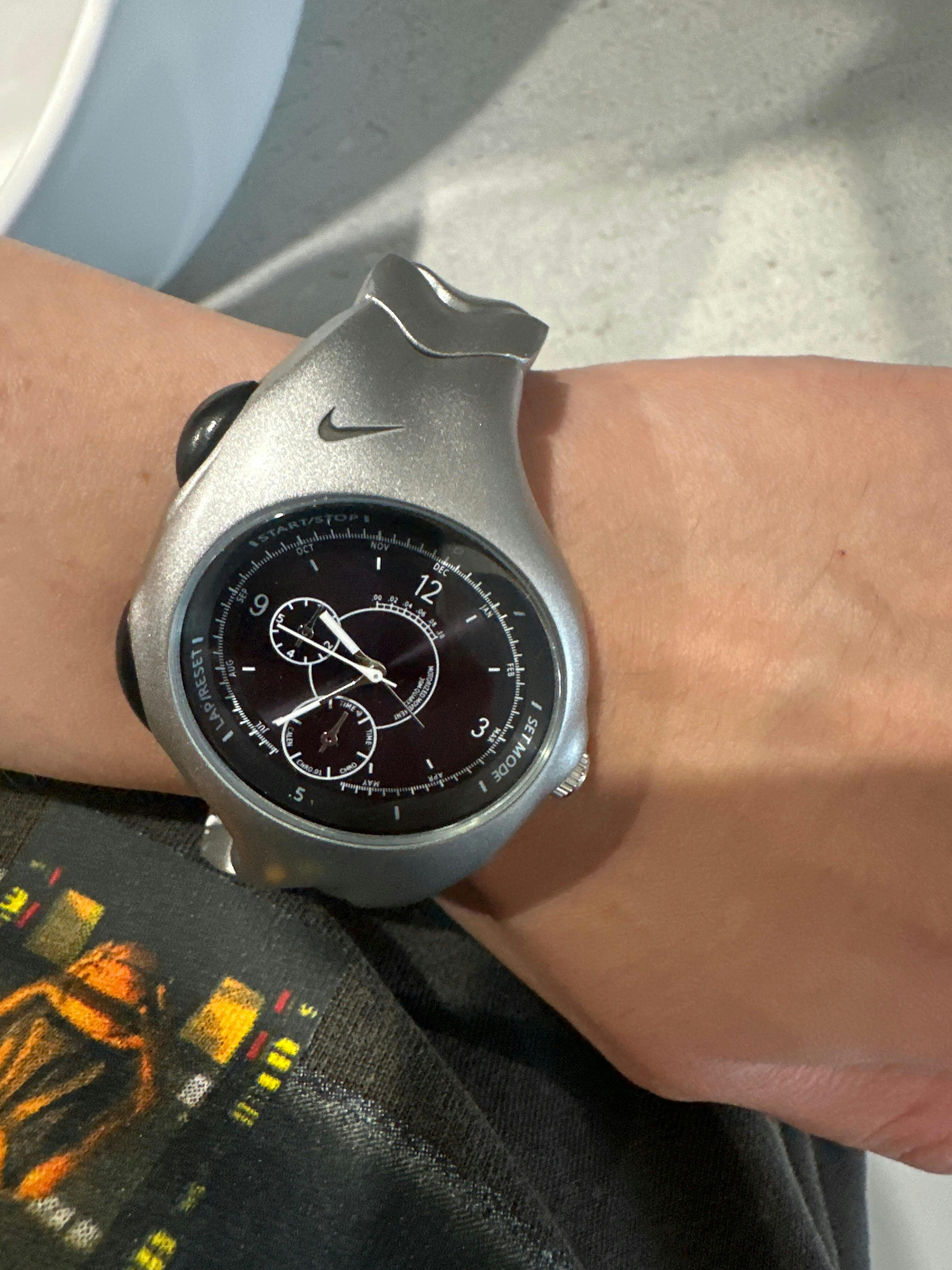 Nike Triax Chronograph Watch – Metallic Silver Wave-Link Band, Black Dial | Vintage Nike Sports Watch